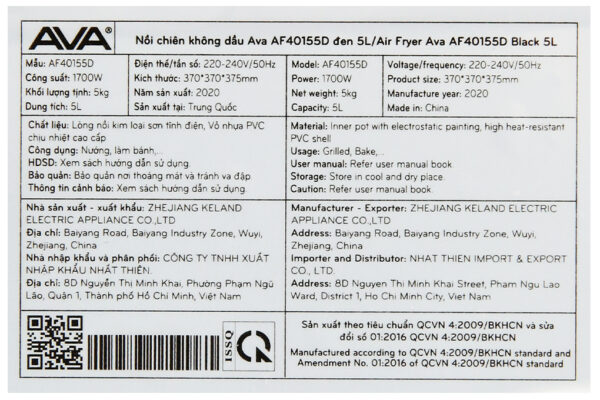 Nồi chiên không dầu Ava AF40155D 5 lít  - Công suất